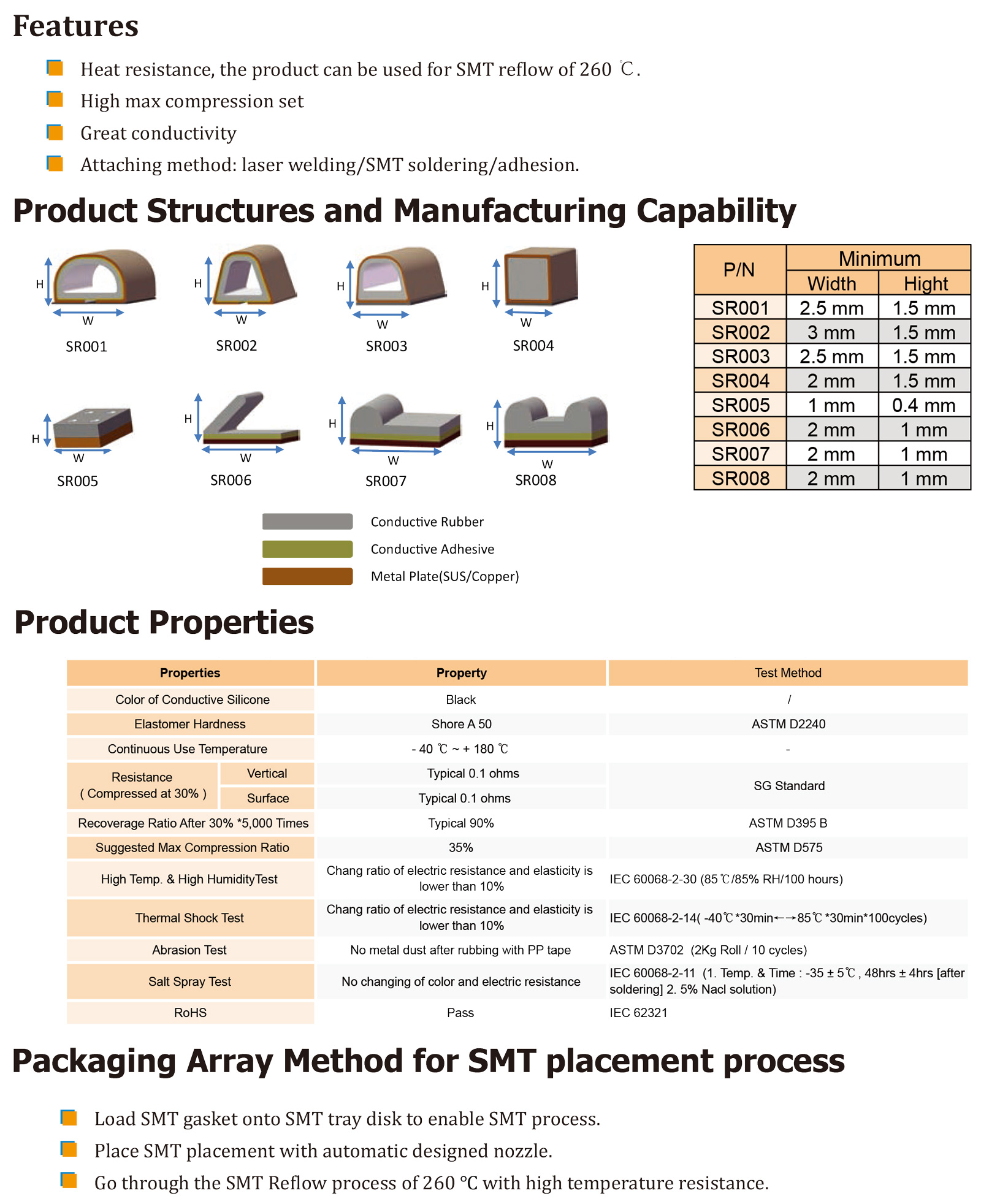 TM SR 系列 SMT橡膠墊圈呈矩形,寬度較窄,設(shè)計(jì)用于接地 用于PCB和FPCB的焊盤或連接器,可以大大降低電子產(chǎn)品的EMI/RF噪聲。它是一種可回流焊接的彈性導(dǎo)電介質(zhì),可通過SMT安裝在PCB和FPCB上。" />